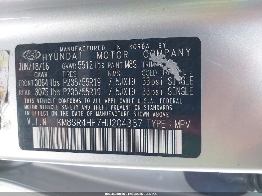 VIN: KM8SR4HF7HU204387 • Lot: 44000466 • IAAI
