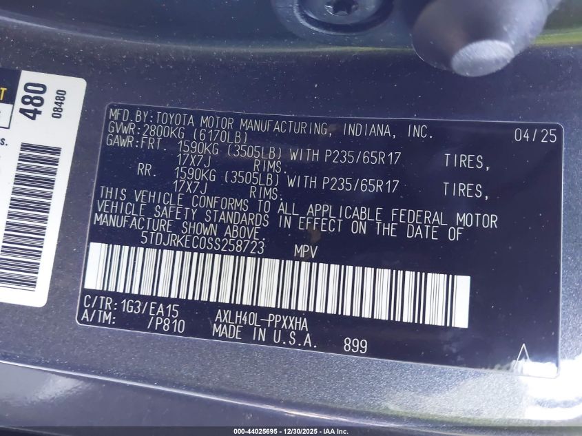 VIN: 5TDJRKEC0SS258723 • Lot: 44025695 • IAAI